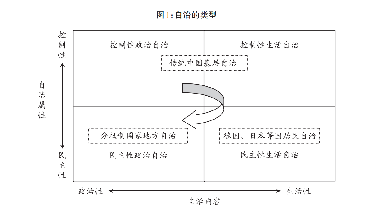 任何自治都是就特定领域和事务而言的,不存在包揽一切的自治。自治既意味着共同体在特定事务上有一定的自主性(相对外部控制而言),又意味着共同体内部的相互控制(就不同个体之间而言),后者同时又构成对外部控制的一种补充(达尔,2006:15,29)。自治可以从两个维度进行理解:自治内容和自治属性。从自治内容上看,自治包括了政治自治(autonomy)与生活自治(self-governance)两种类型。政治自治是指共同体不受外部干预自主管理部分地方性公共事务的活动,而生活自治是共同体成员在社区日常生活领域中开展的自主合作。从自治属性上看,可以将自治活动分为民主性自治与控制性自治。民主性自治更强调共同体内部公共权威生成和运作的民主特征;控制性自治则更强调公共权威对于共同体活动控制的有效性,但这种控制未必一定遵循民主原则。