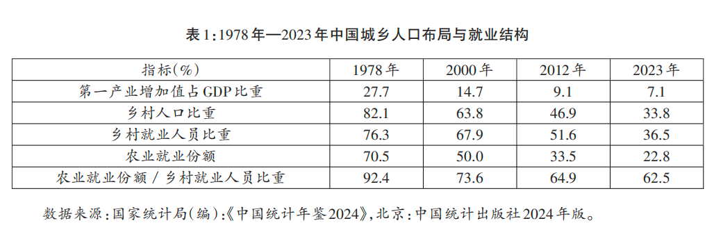 当前,城乡经济结构和人口布局已经发生质地之变。历史上,包括中国在内的原住民国家普遍存在规模庞大的农村人口,这不但造成农业生产的过密化和低效率,还是乡村依附性社会关系形成的经济根源。乡村治理现代化的一个重要前提就是乡村人口比重和农业就业份额的同步下降。2023年,中国第一产业增加值占国内生产总值(GDP)的比重已经下降到7.1%,乡村人口比重已经降低到33.8%,农业就业份额降低到22.8%,乡村社会基础条件相比于改革开放之初已经发生巨大变化。1978年,农业就业占乡村就业的90%以上,也就是说当时的农村劳动力主要是从事农业,2023年这一比值已经降低到62.5%(见表1)。这意味着,相当比例的农村人口已经不以农业为就业渠道,经济多样性的增强是乡村经济走向发达的重要标志。经济指标变动的背后是一系列基要生产函数从低级向高级的跃迁,这意味着乡村已经逐步从一个低效率的贫困人口聚居系统向高效率的专业化社会迈进。